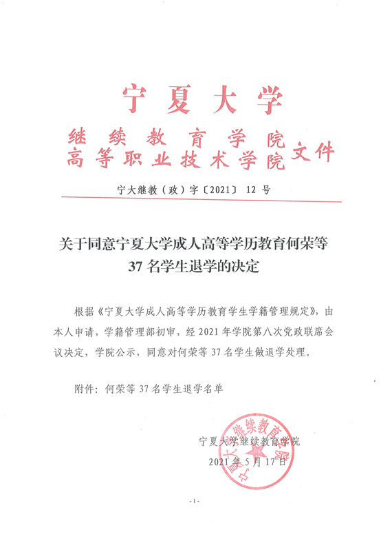 关于同意开云全站成人高等学历教育何荣等37名员工退学的决定