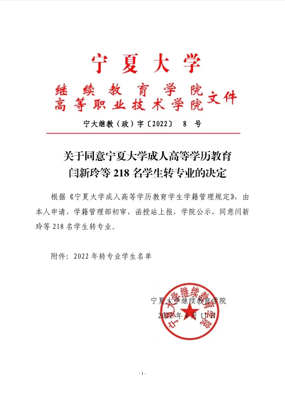 关于同意开云全站成人高等历教育闫新玲等218名员工转专业的决定