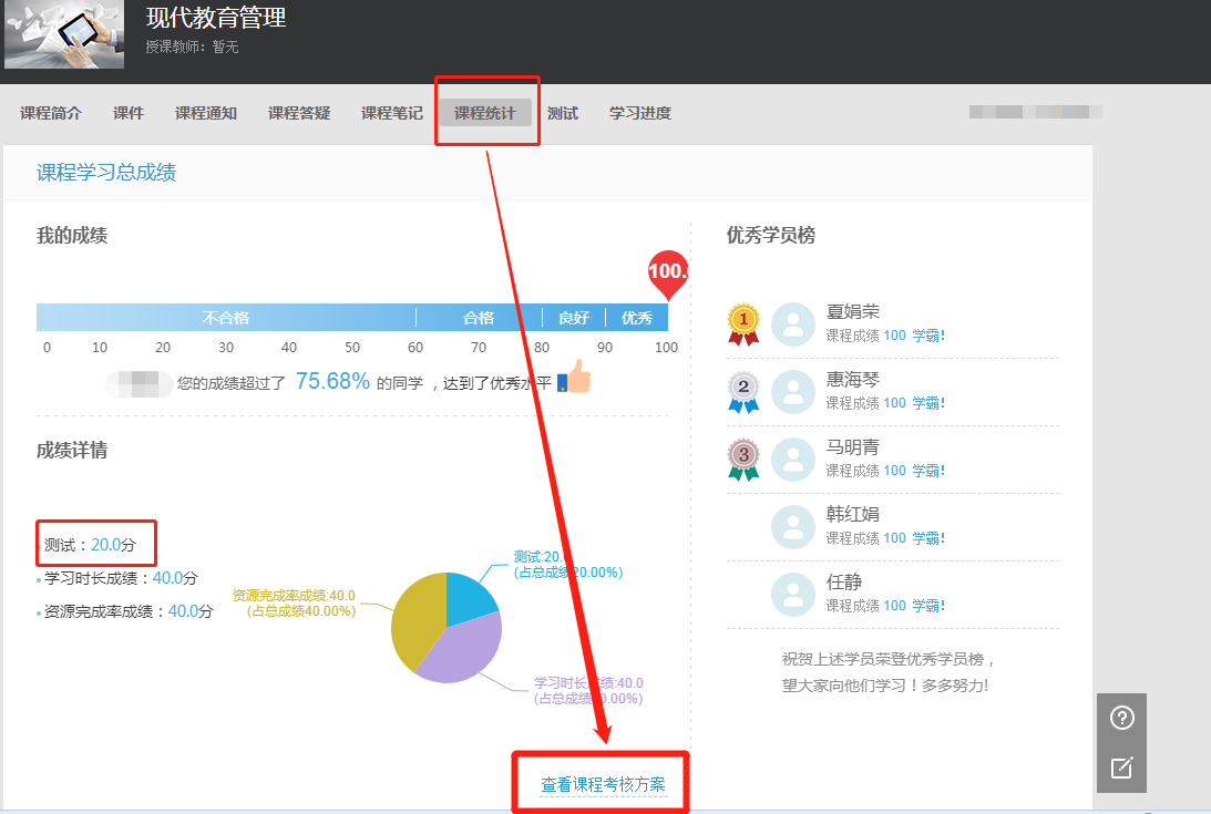 平时成绩=作业(测试)分数+学习时长分数+资源完成率分数,每门课程的作业或者测试的分数占比请点击“课程统计”中的“查看课程考核方案”。
