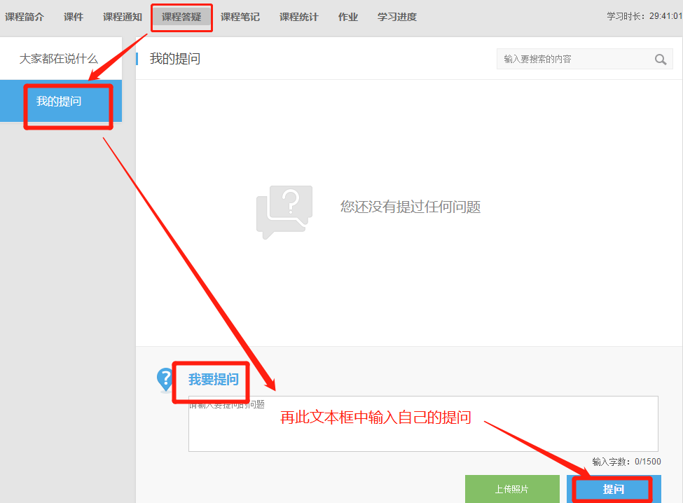 1.打开需要提问的课程,点击“课程答疑”,进入提问页面;