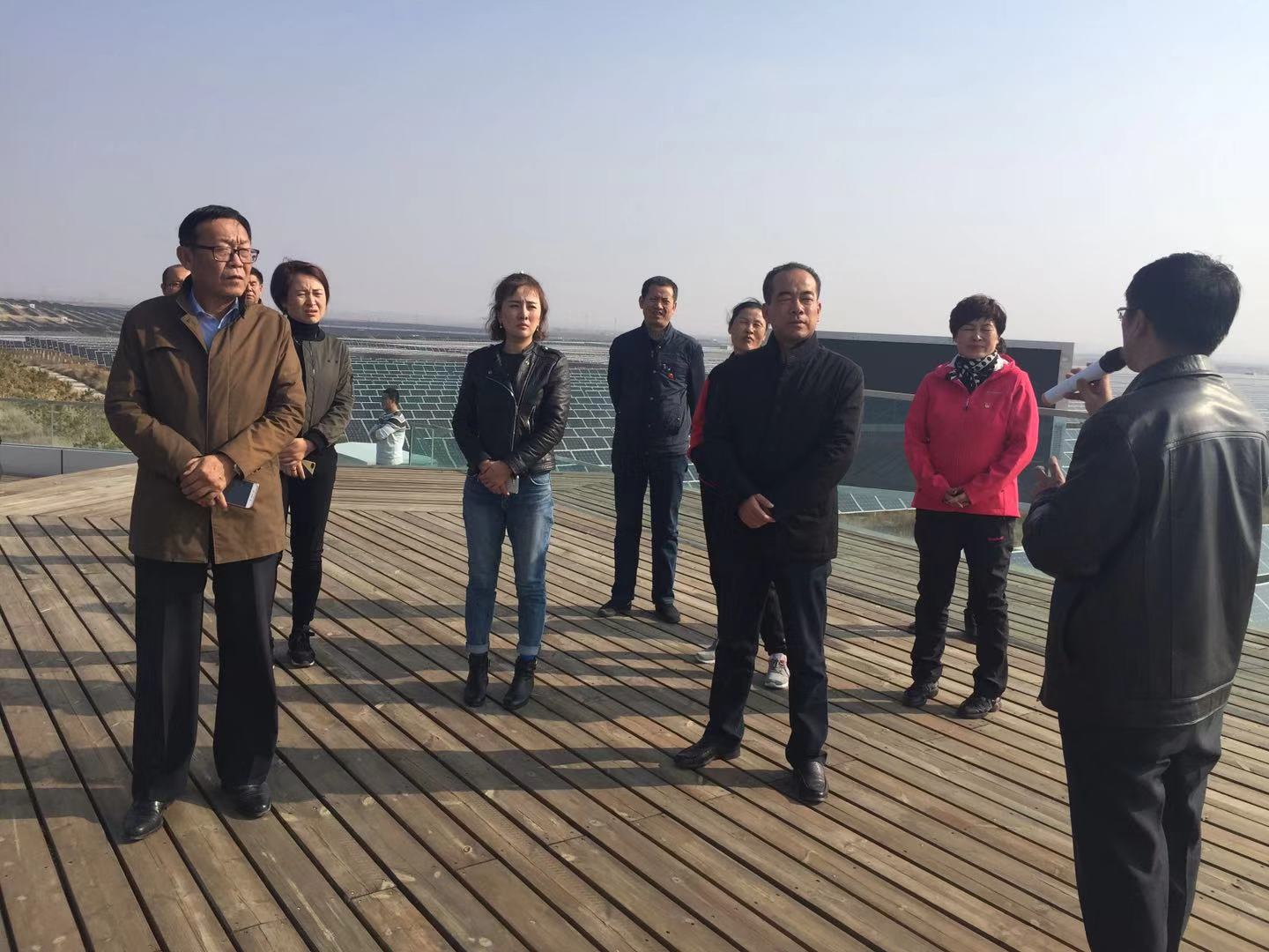 随后,围绕“精准脱贫”这一主题,在盐池县有关部门的引导下,全体党员先后参观了在盐池县脱贫摘帽中具有典型“麻雀效应”的盐池鑫海食品有限公司和高沙窝镇长流墩村。鑫海食品有限公司是一家集农业种植、滩羊养殖、滩羊肉深加工和销售于一体的综合性滩羊肉产品加工企业,其采取的“公司+农户”运转模式所精心打造的滩羊肉系列产品已成为全国知名品牌,并对引领周边农民精准脱贫发挥着极其重要的作用;在高沙窝镇长流墩村所建成的全球最大单体光伏电站现场,大家仔细聆听了李镇长对当地乡村振兴和光伏扶贫情况的详细介绍,对政府与企业联手所探索出的“光伏+产业养殖”“光伏+村级扶贫电站”“光伏+美丽乡村”“光伏+金融扶贫”等多元化配套扶贫开发模式有了更深地体会与叹服。