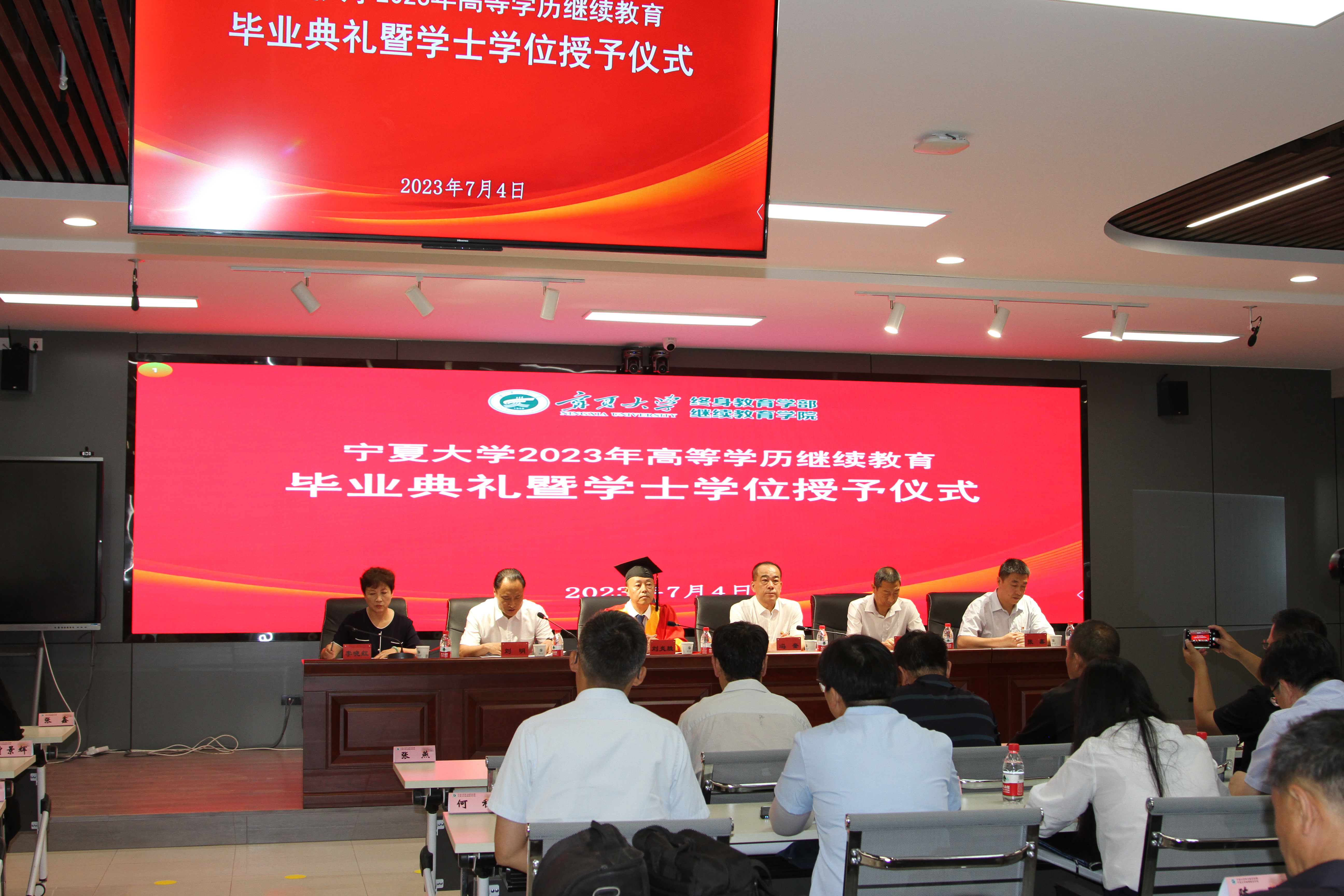 冯奎宣读《关于授予刘小玲等81人高等学历继续教育本科毕业生学士学位的决定》。刘炎胜为获得学士学位的员工颁发学士学位证书。