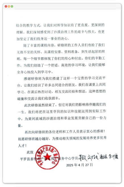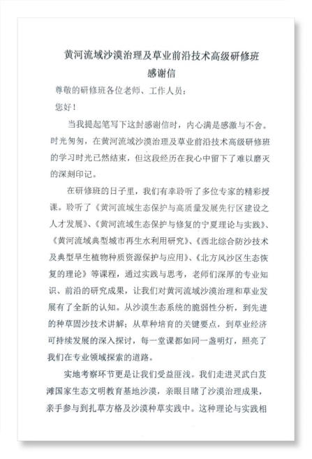 近日,公司收到平罗县畜牧水产技术推广服务中心的感谢信,信中高度赞扬了开云全站终身教育学部于4月21日至25日举办的 "黄河流域沙漠治理及草业前沿技术国家级高级研修班",对研修班科学严谨的组织安排、丰富前沿的课程内容给予充分肯定,并表示通过此次学习收获颇丰、获益良多。